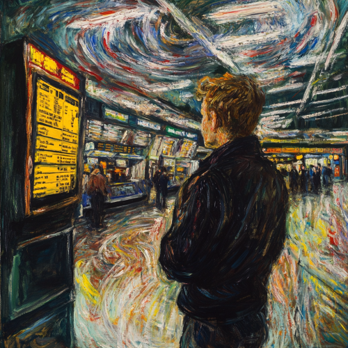 A man stands at the departure gate, but instead of ordinary planes, the runway stretches into surreal landscapes, with melting clocks draped over the seats and twisting, distorted shadows. His figure is elongated and slightly exaggerated, adding to the dreamlike quality. Dali-inspired surrealism with bizarre, dreamlike distortions and surrealistic details. --s 50 --style raw