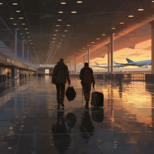 A lone traveler standing in a nearly empty airport terminal, bathed in the warm glow of sunrise as he gazes at the plane outside. The scene is imbued with a sense of quiet anticipation. Realistic style, wide-angle shot, capturing the serene mood and architectural lines of the terminal --s 50 --style raw