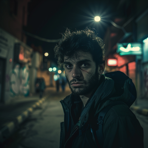 a man stanidng at sunset loooking at the camera with a severe look and behind him isolated street in a cinematic look and feel