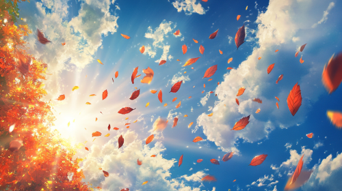 a lot of orange, red, crimson, yellowish, greenish autumn leaves flying in the blue sky and white fluffy clouds, warm, welcoming, relaxing atmosphere, lit by the autumn sun, fantasy-like feel, the whole area is a little filled sun beams --ar 16:9