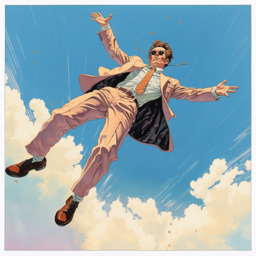 man dressed in a suit falling through the air with no background by Moebius