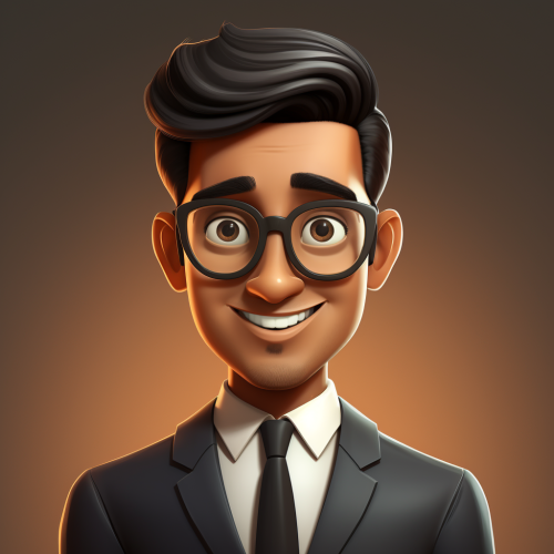 well suited indian man with thick black frames and plain glasses and wearing tie. showing confident smile and positive attitude, 4k, cartoon