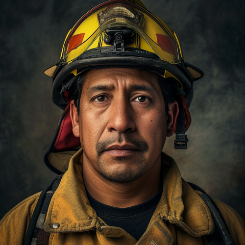 adult latino fire search and rescuer headshot image in uniform with a grainy gray background, man with black hair suited as a search and rescuer, calm face, realistic, --v 6.0