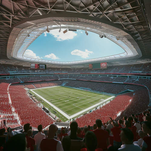 a full football stadium, photorealistic, use the colors red and white for the clothes of the people, on a summer day --v 6.0
