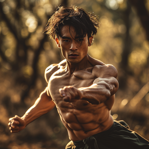 A dynamic outdoor portrait of a young Japanese male actor, capturing his energy and athleticism. Emphasize his fit physique and confident posture in a natural setting. High-resolution, shot with a Nikon Z7 II for stunning clarity and lifelike detail. --s 250 --v 6.0