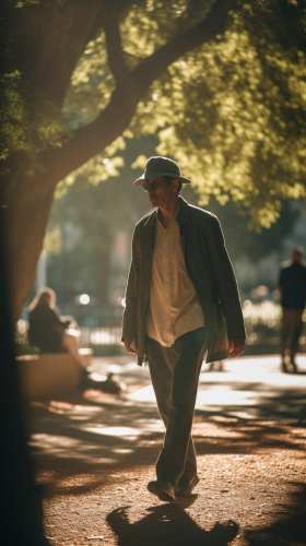 A person aged 42 or older with a refreshed, energized expression, stretching or walking outdoors in a serene, well-lit park during early morning. Minimal greenery and soft morning sunlight filtering through the trees create a calming, uplifting atmosphere. Simple, natural setting. --v 6.0 --ar 16:9 --style raw --s 750
