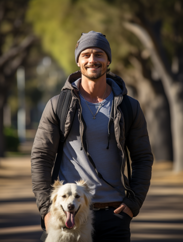 A full-body shot of a man in his late 20s with a neatly trimmed beard, dark hair under a blue flat cap, wearing dark sunglasses and a burgundy button-down shirt, sitting on a bench in a sunny park beside a large white dog with pale blue eyes and joyful expression, surrounded by lush greenery, soft lighting, gentle warm sunlight, shot with a Canon 5D Mark IV, 50mm f/1.4 lens, vibrant yet calm color palette, Pixar cartoon-style illustration --ar 3:4 --stylize 500 --version 5.2