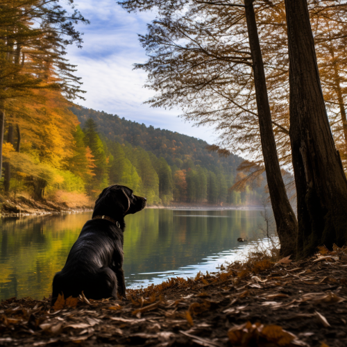 a St Bernard walking Autumn colors. Colorful fallen leaves in the lake. Magnificent landscape. Yedigoller National Park. Bolu, Istanbul, Turkey --c 11 --style raw --s 55