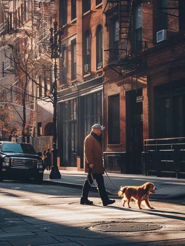 imaging ultra photorealistic 8k image showcasing the old man and old golden retriver are walking at a distance, heaveanly feeling, spritual lighting , like god is blessing in heaven , flowers falling --ar 16:9 --stylize 200