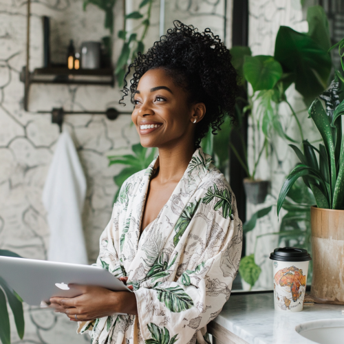 black woman standing in robe in beautiful green plant bathroom looking in room with laptop on counter and coffee mug with african map coffee mug smiling