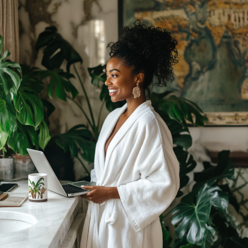 black woman standing in white robe in beautiful green plant bathroom looking in room with laptop on counter and coffee mug with african map on it smiling