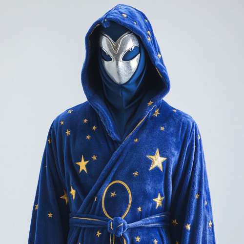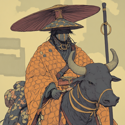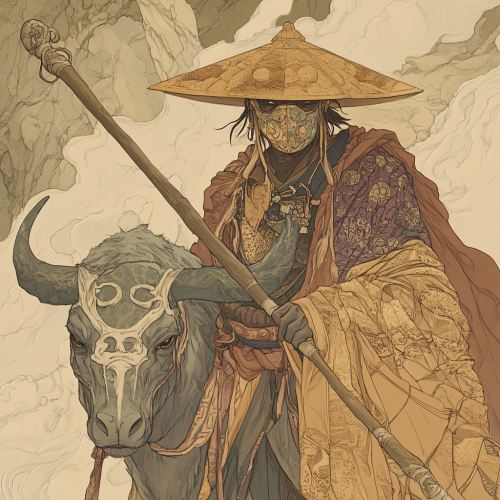 a chinese monk in a quilted robe with a quilted mask with a large brim hat. he holds a staff with ring on the end. He rides a shostly ox that he summons. make it in the style of tomer hanuka high drawing comic detail