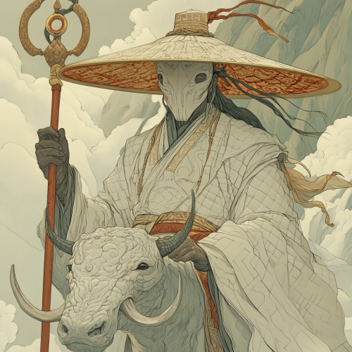 a chinese monk in a white quilted robe with a white quilted mask with a large brim hat. he holds a staff with 4 ring on the end. He rides a shostly ox that he summons. they ride through a misty moutain make it in the style of tomer hanuka and alphonse mucha high drawing detail