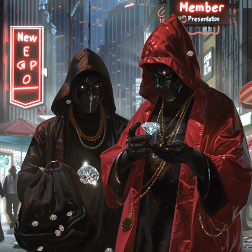 realistic baddass black Guys frat with black Masks and red robe cape monk that look very suspenseful, one guy got a loot bag full of diamonds holding it over one shoulder One guy is Holding one Diamond in the air with the tips of his finger like he’s admiring it. One guy is putting on his mask with the a glowing Kappa Diamond siluette, cinematic, imax, destroyed usa florida city on the background, a 3D neon sign with cool lettering that says "New Member" and " Presentation" as a subtitle --v 6.0 --style raw