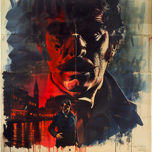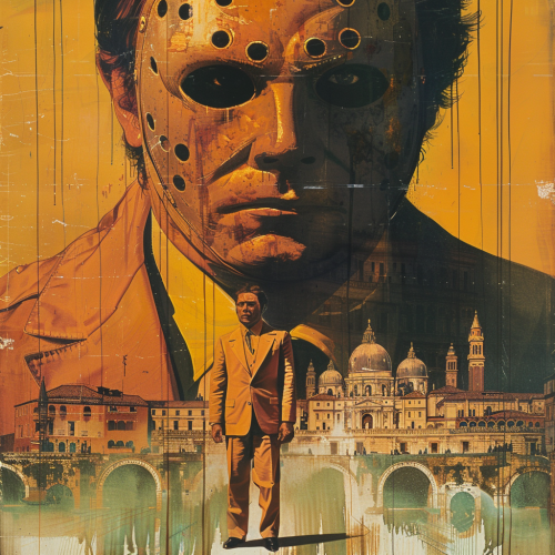 a 1980 horror revenge movie poster, a gangster haunted by a venetian evil mask,