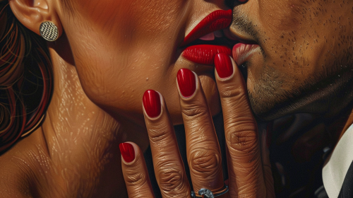 a hyperrealistic, photo realistic, extreme close up of an indian woman's mouth, wearing red lipstick whispering into a mans ear. she has red nail polish, you can only see her mouth and his ear --ar 16:9