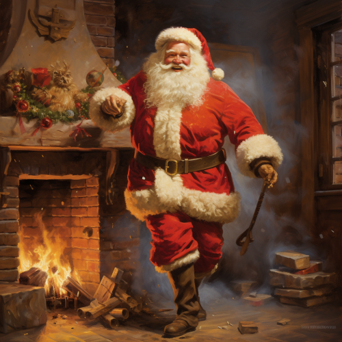jolly Santa in his red suit and black boots with a large red sack stepping out of the fireplace with a coffee table and milk and cookies and furniture cartoon style