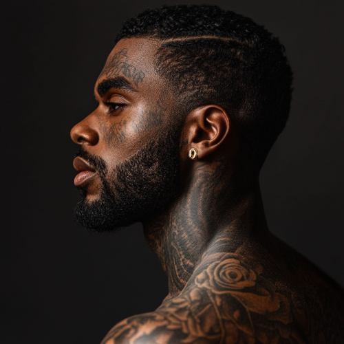 A black man with detailed tattoos, in a contemplative pose with head slightly turned to the left. He has close-cut, fine silky hair. He has a beard. The dramatic lighting reflects on his tattoos and rich CHOCOLATE DARK COMPLEXION.