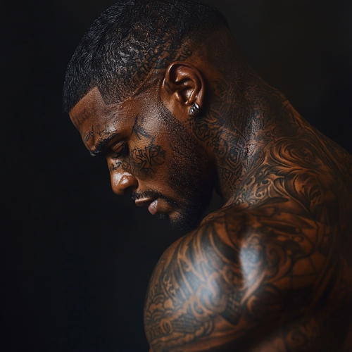 muscular black man with detailed tattoos, in a contemplative pose with head tilted down. He has close-cut, fine silky hair. The dramatic lighting reflects on his tattoos and rich CHOCOLATE DARK COMPLEXION.