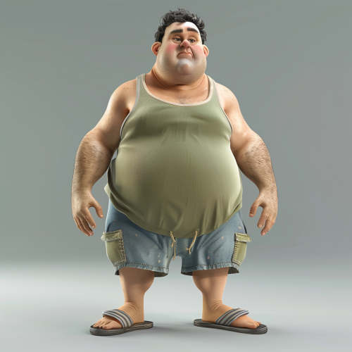 Cartoon 3D, exaggerated expression, a very funny fat man wearing tank top shorts and slippers, realistic portrayal, focus stacking --v 6.0