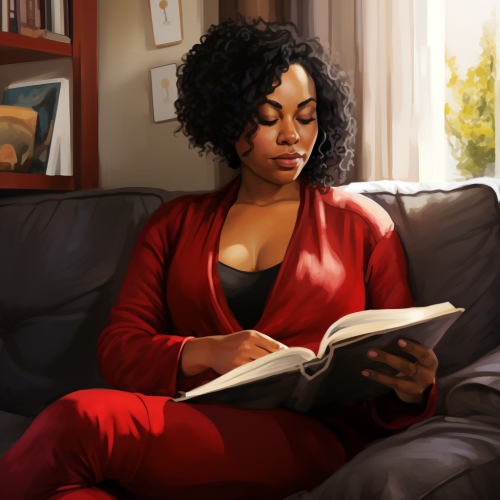 generated image of an African-American plus size woman, sitting in front of her couch, writing in a journal, drinking out of a wine glass , cartoonish, also realistic