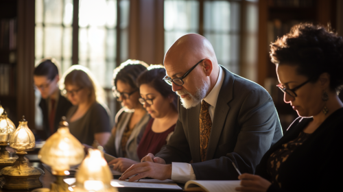 photograph of several very attractive women writing in a nineteenth-century library. warm light. appearance of real people. many details. in the background rob halford, bald with glasses and goatee, dressed very elegantly --ar 16:9