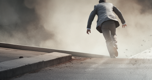 High-definition photo from a single story rooftop perspective looking downward. A metal ladder extends down from the edge of the roof to the ground below. On the ground, a human is lying flat in a humorous and exaggerated pose, because he has just fallen. The scene should capture the view from the roof, with the ladder prominently in the foreground and the human visible below. The background is a plain white backdrop with no shadows, maintaining a clean and isolated look that emphasizes the perspective from the rooftop down to the ground. --ar 3:4