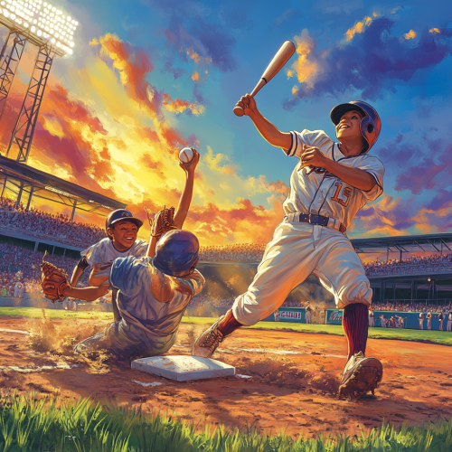 An inspiring illustration of young baseball players in action: one player hitting a home run, another sliding into home plate, and a pitcher throwing a powerful pitch. The scene is filled with energy and excitement, capturing teamwork, determination, and the thrill of the game. The background features a vibrant stadium with cheering fans and a glowing sunset sky, symbolizing passion and achievement. Artwork is colorful, uplifting, and crafted to motivate young athletes