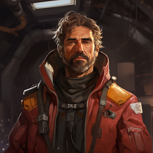Generate a profile picture for Asher Kaine, portraying a rugged and determined strategic space cowboy, best known for his expertise in repairing and repurposing salvaged starships.