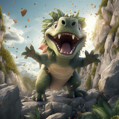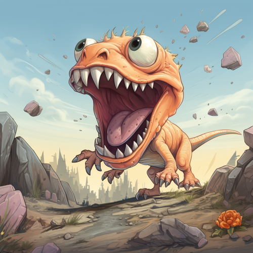 The dino is hit on the head by the stone. It has an expression of pain and angry cartoonish action scene