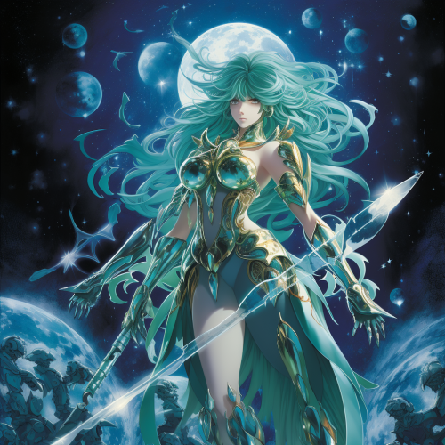 female saint seiya, full body photo with Kurosu on, bold color, Showa era, neon light, --ar 16:9 --v 6.0 --stylize 750