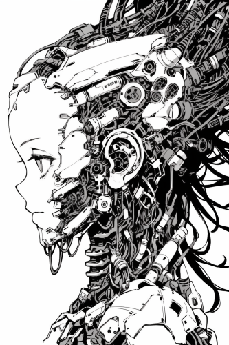 cute but scary, half body shot of a manga cyber demon robot girl, line drawing illustration in the style of katsuhiro otomo and frank miller, black and white, high contrast, cel shading, thick outlines, white background, --ar 2:3 --niji 5
