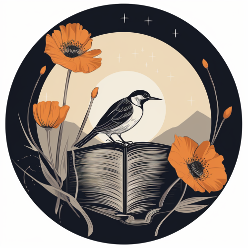 circular logo — black and white — transparent background, with the following items in it: a California poppy, a quill pen, planet earth, an open book, a key.