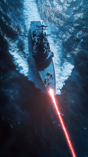 Aerial view of the Dragonfire laser system on a navy ship, firing at a fast-moving enemy fighter jet approaching at high speed, the beam striking with pinpoint accuracy, surreal, hyper-realistic, Ultra HD --ar 9:16