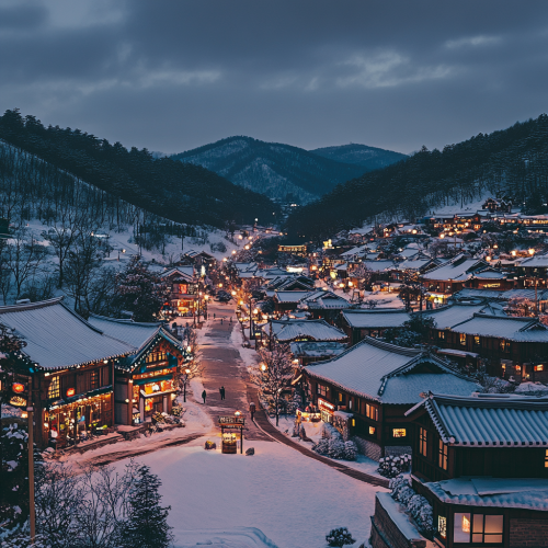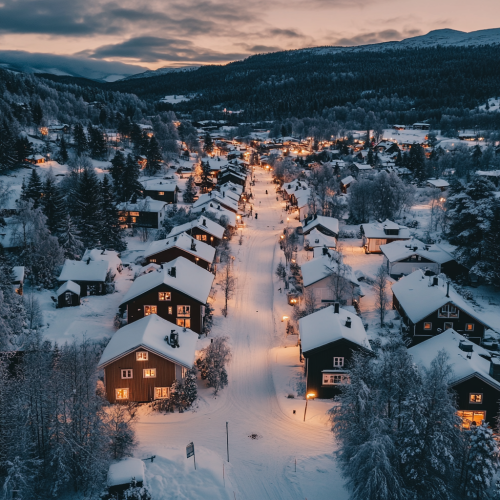 Top view, High Angle shot, front view, hyper realistic, winter, dusk, snowy, Nordic fairy tale style village, mountain view, snow covered streets, christmas, beautiful, warm atmosphere, Canon EOS R5 with a 200mm lens, --style raw --v 6.1 --ar 1:1