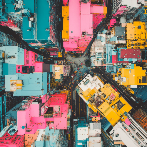 view aerial top view, an abstract image combining vibrant, youthful, sassy, edgy, funky, unconventional visual elements to the Sham Shui Po district of Hong Kong