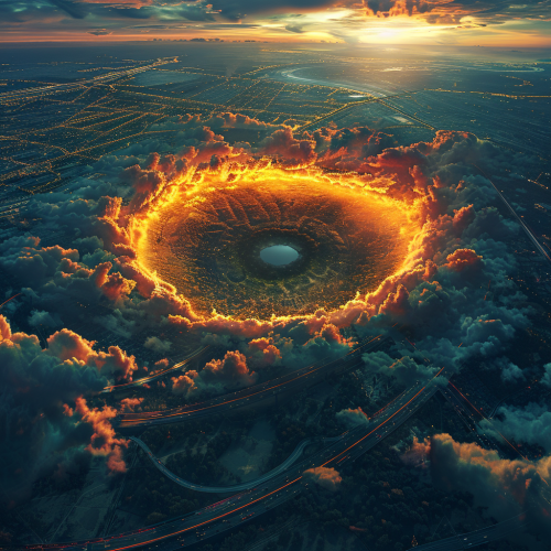 an aerial view of a highway road nest shaping like an eyeball. Dusk. --s 750 --v 6.0