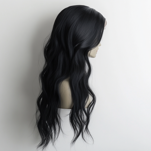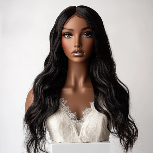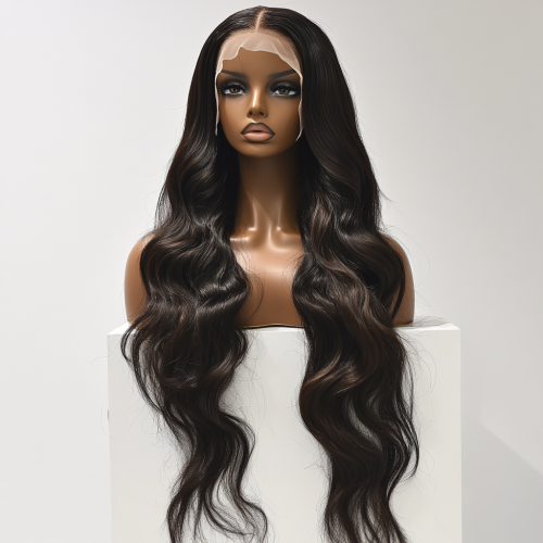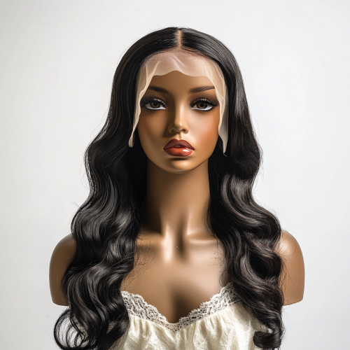 Capture a high-definition stock photo of a UNice 13x4 Lace Front Body Wave Transparent Lace Wig on a mannequin. The mannequin should represent a black woman with any skin tone. Style the wig with a deep side part, and ensure the focus is on the realistic appearance of the transparent lace front. The background should be a white studio setting with excellent lighting to highlight every detail of the wig and lace.