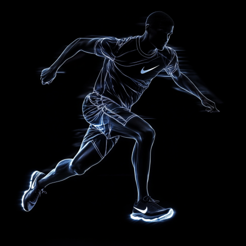 Create a powerful, artistic image of an athletic mannequin dressed in Nike gear, posed dynamically against a pitch-black background. The mannequin should wear a combination of Nike sports apparel, including a jersey, shorts, and running shoes, capturing a sense of motion and strength. The lighting should highlight the contours and textures of the outfit, emphasizing Nike's innovative fabric technology and design. The background should be completely black to focus attention on the mannequin, creating a bold and professional look suitable for an 'About Me' page in a portfolio.