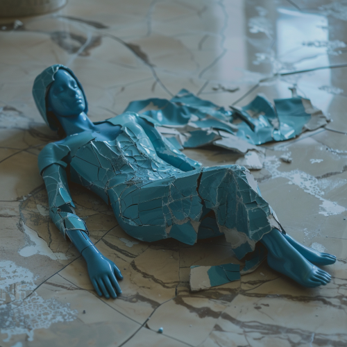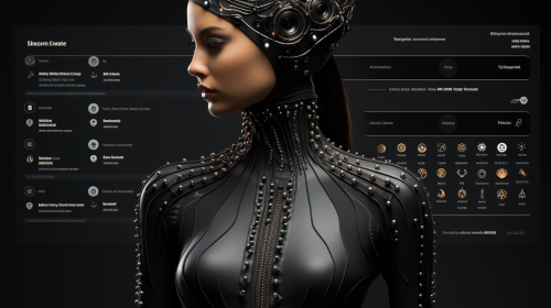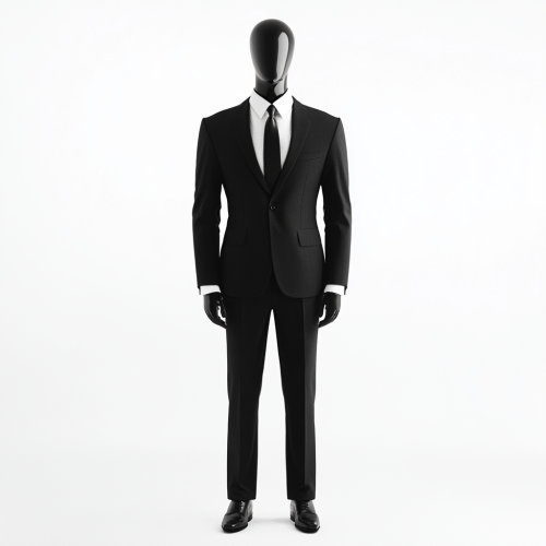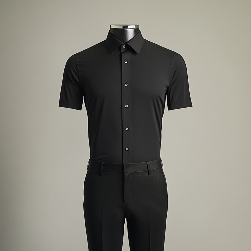 mens black short-sleeved shirt displayed on a mannequin with black tight trousers, the fabric tight and form-fitting, showcasing the sleek design and premium craftsmanship. The mannequin is positioned in front of a light grey background, creating a minimalist yet elegant setting that emphasizes the shirt’s silhouette. The shirt’s surface catches the soft, diffused light, highlighting the fine details and texture of the material. Volumetric lighting adds a subtle glow, enhancing the luxurious feel of the product. Photographed by Steven Meisel with a Nikon D850, Award-Winning Photography style, Volumetric lighting, 8K, Ultra-HD, Super-Resolution. --v 6.1