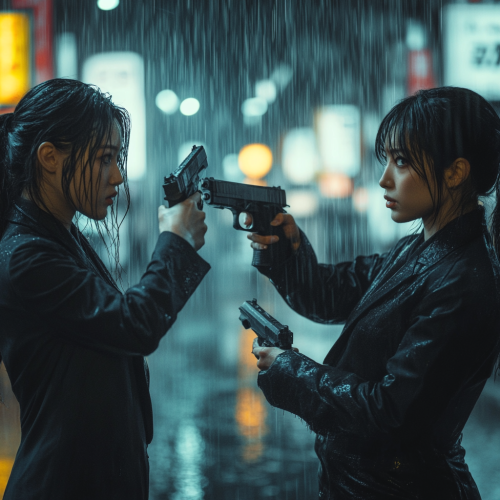 Two Japanese sisters in their mid-30s are standing in the rain, pointing guns at each other. The scene has a gritty 70s film vibe, with a moody, cinematic atmosphere. Both sisters are dressed in black clothes, but the one with long, wet hair is wearing a sharp black suit, while the other with a sleek bob cut is in a black outfit. The rain creates a dramatic effect, with water droplets visible in the dim light. The background is a dark, urban setting with subtle neon reflections, enhancing the intense and suspenseful mood of the confrontation.", "size": "1024x1024"