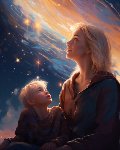 magical fantasy style, young blond boy and his giant mommy looking up at the stars and comets together, magical sunset hues, --ar 4:5