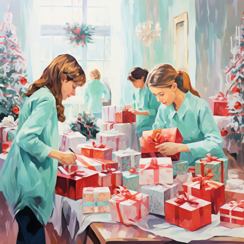 christmass gifts assembly line, elfs, pastel colors painting --style raw