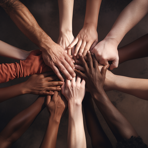 An image in the style of a shadow or spilled ink, A closed circle of hands holding a small plant. This symbolizes community, healing and family connection. --ar 3:4