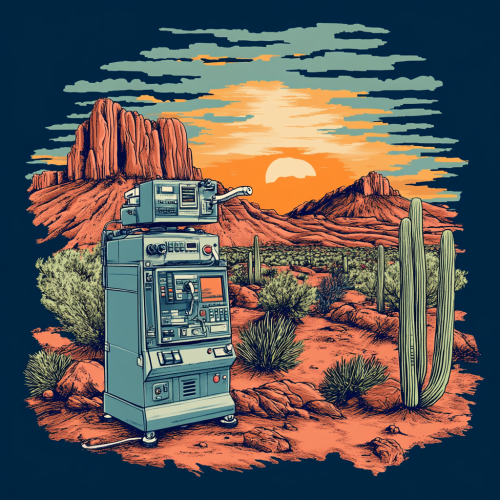 Design a t-shirt for the Society for Technology in Anesthesia conference that takes place in Tempe next year. The design should include typical outdoor SouthWest imagery with an anesthesia machine in the foreground. It should use no more than 6 colors in the t-shirt design.