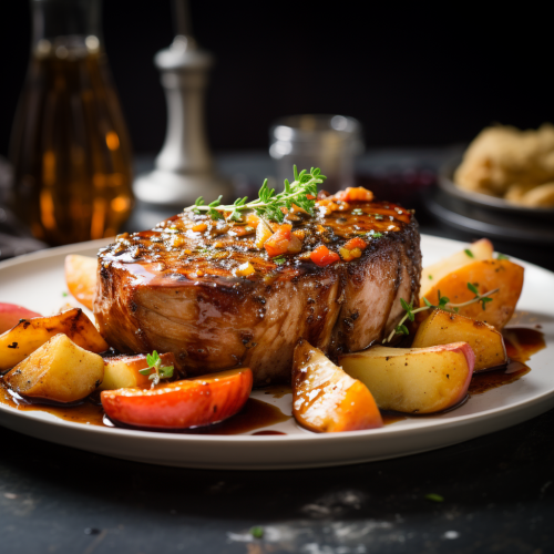 Maple Glazed Pork Chops with a side of Roasted Red Apples and Yams white plate, white marble background, shot by Nikon D850 with topcor 58mm f/ 1. 4 lens, ultra high details, photorealistic, 8k --s 250
