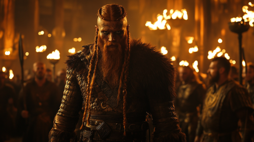 A still from fantasy D&D universe movie, photorealistic, full body view of a sixteen tall viking hunter with long red hairs and long red beard with braids, wearing leather clothes with Celtic's patterns, standing in middle of a viking's Thing in Wooden Throne Hall filled with crowd, lite on torches on walls --ar 16:9 --v 6.1
