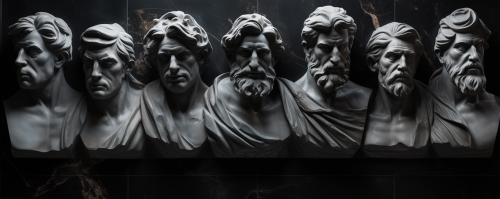 5 marble busts of beautiful young men and women, standing by a black stone wall, on pedestals, elegant, luxurious, symetrical, --ar 5:2