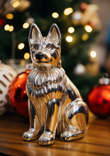 a german shepherd in the style of ornament figurine sitting on christmas shelf close-up, mercury glass --ar 5:7 --seed 1234