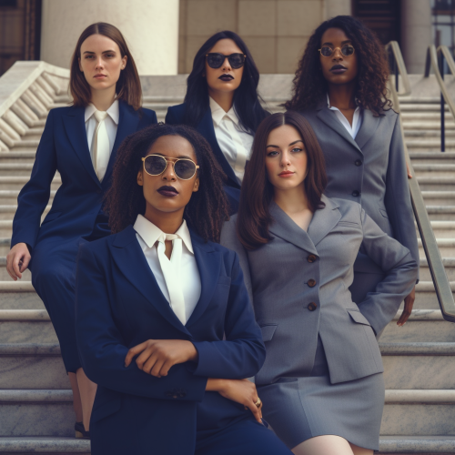 a group of confident, beautiful businesswomen from different races in business pant suits with ties and sunglasses on standing on marble stairs, navy and white photography --v 5.1